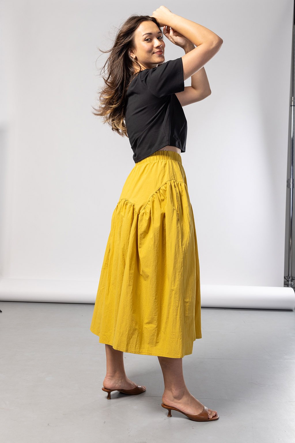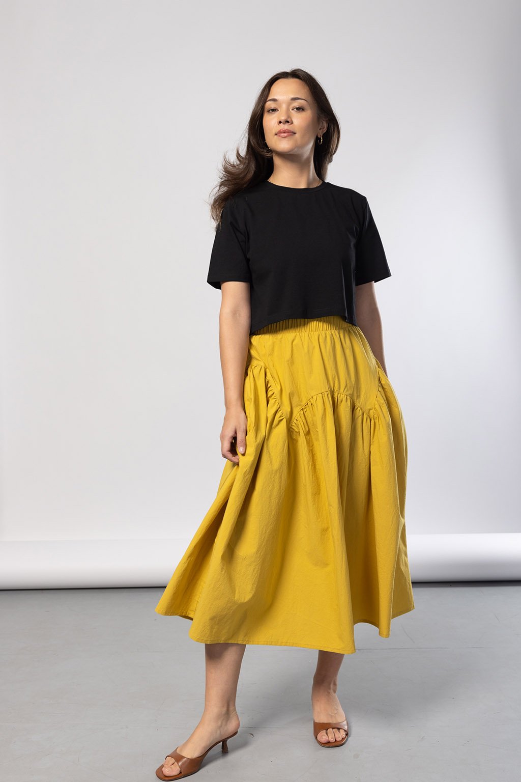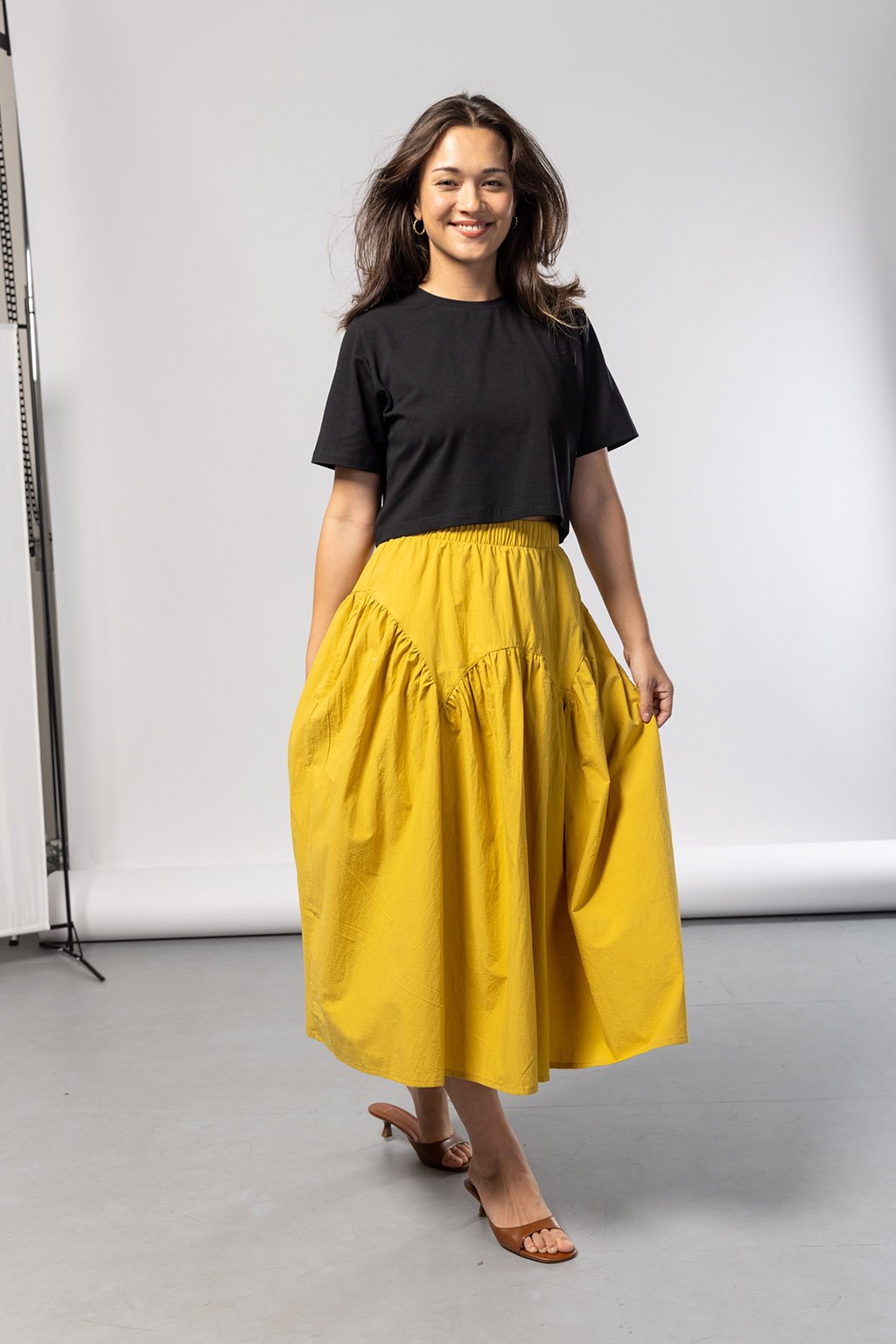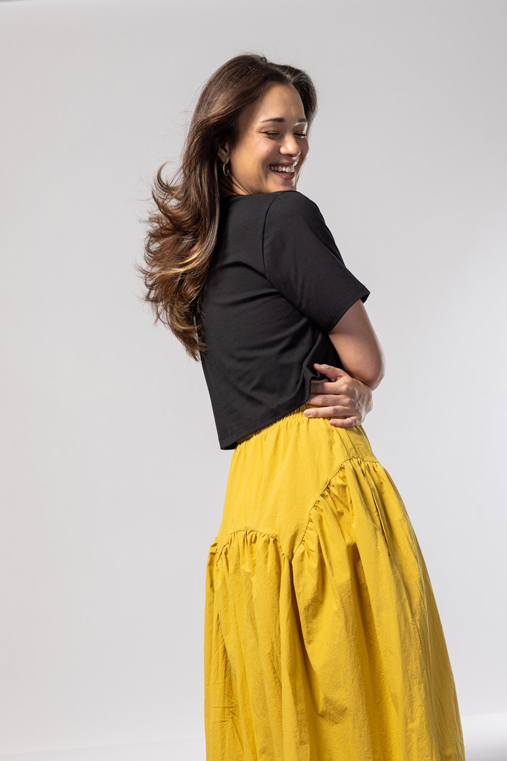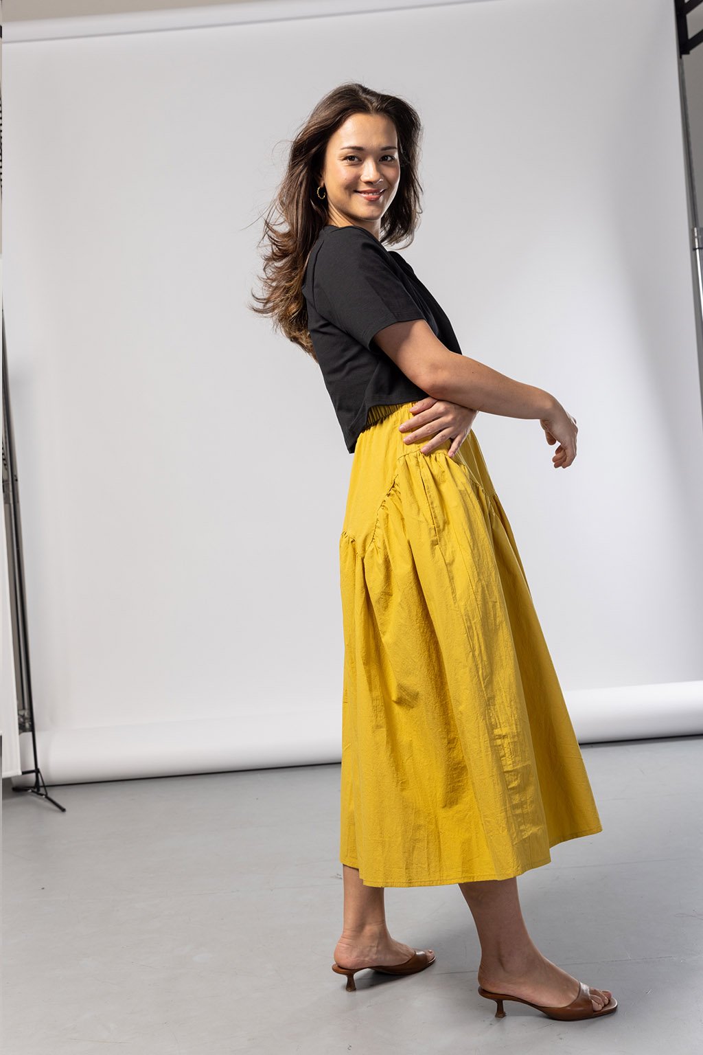 Široká vlněná sukně Ariel v midi délce se vyznačuje asymetrickým romantickým přestřihem, na který navazuje nabíraná sukně. Můžete si vybrat mezi růžovou nebo antracitově černou barvou. Hladký pas a zadní řasený detail na gumu zajišťují pohodlné nošení, a podšívka garantuje komfort po celý den.