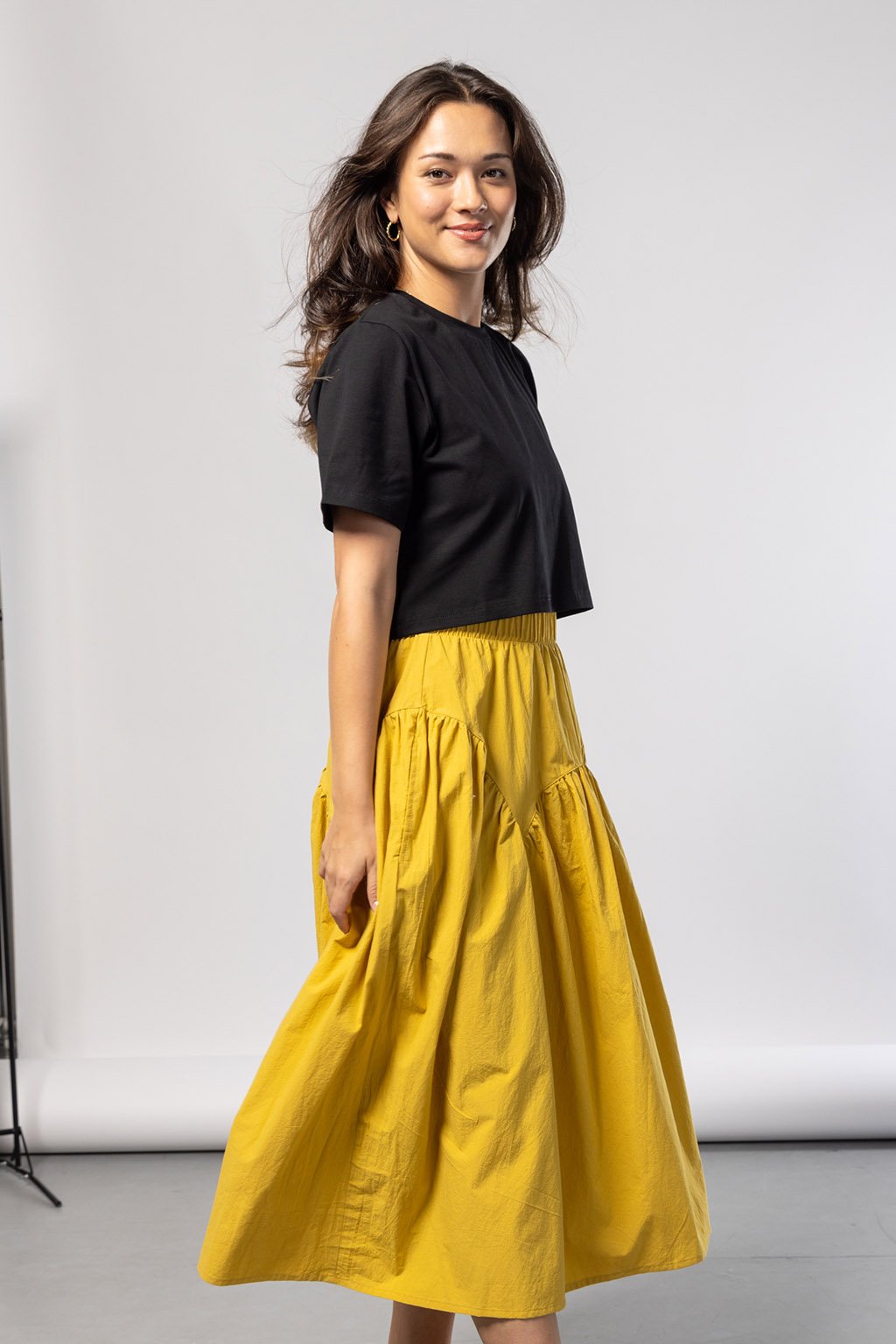 NAĎA jsou dlouhé oversize šaty s řasením na sukni, co působí mladistvě. Hravě kombinují tkanou látku s úpletovým topem z viskózy. Všité kapsy pro vaše maximální pohodlí. Lichotí...