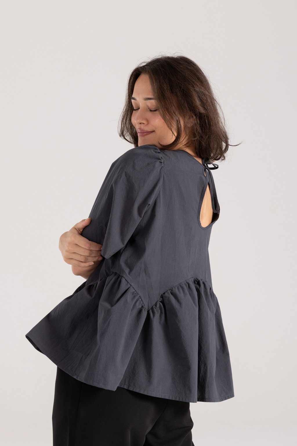 Lehká bavlněná halenka BETTY z bavlny je romantickým kouskem, do kterého se zamilujete. Tato halenka má elegantní střih, který je přestřižený pod prsy, což dodává siluetě jemnou linii a klade důraz na pohodlí. Řasený volán přidává halence hravý a ženský nádech, zatímco nařasené balónové rukávy, poskytují maximální pohodlí. Kvalitní, prodyšný a odolný materiál je nenáročný na údržbu. Kulatý výstřih je na zadní straně zakončený kapkou se zavazováním na mašli. Můžete si vybrat z barevných provedení ve smetanové bílé, šeříkové růžové nebo tmavě šedé.