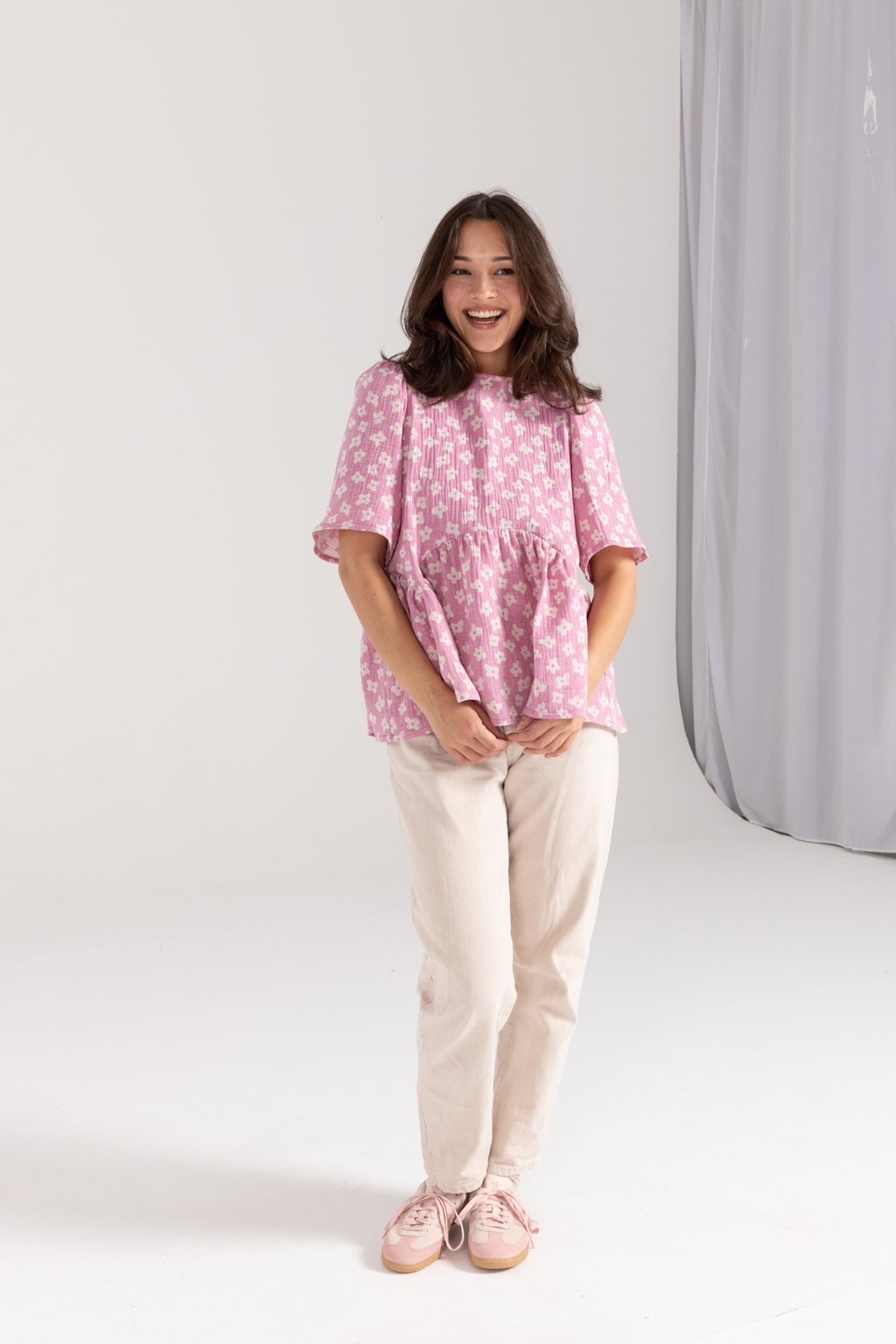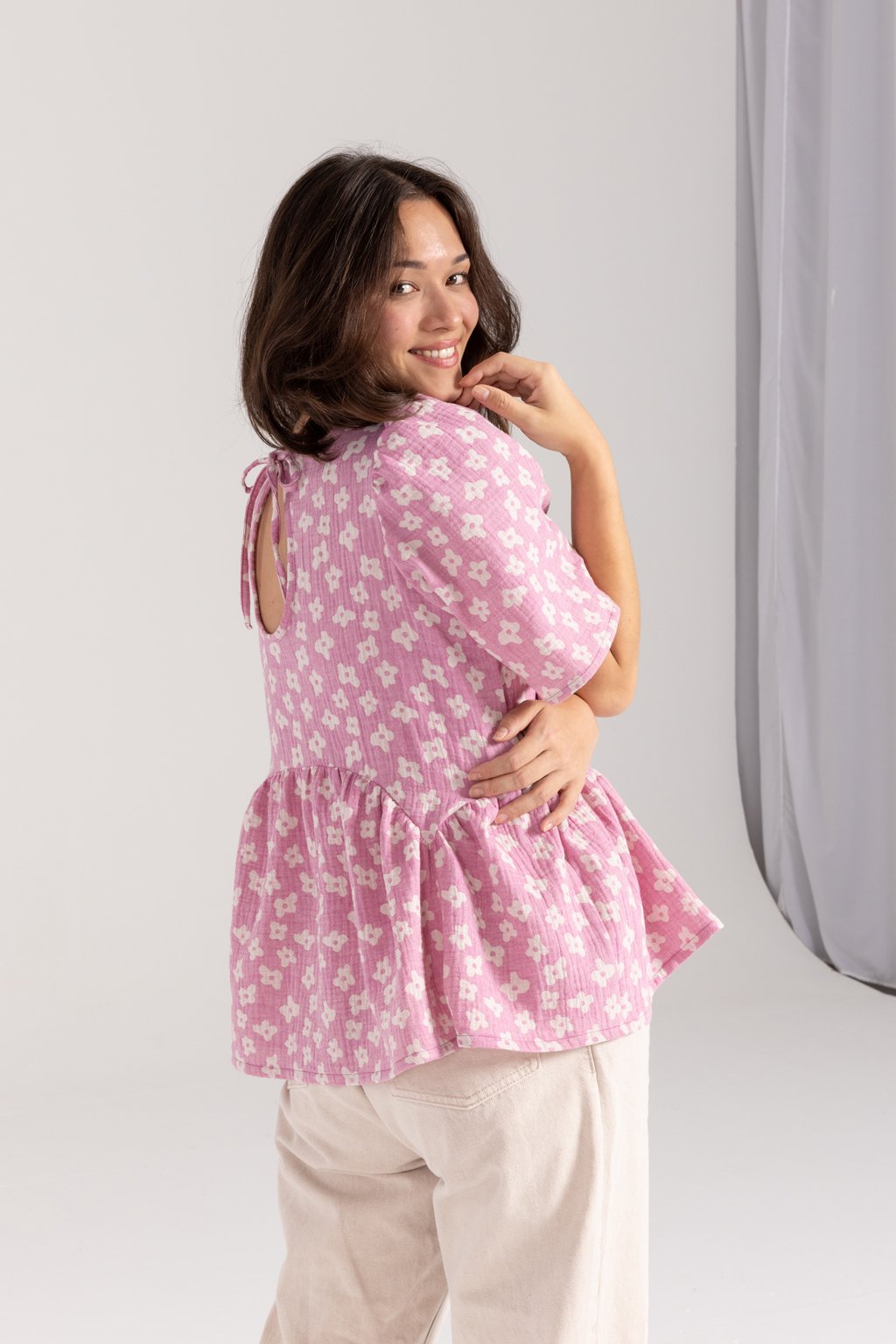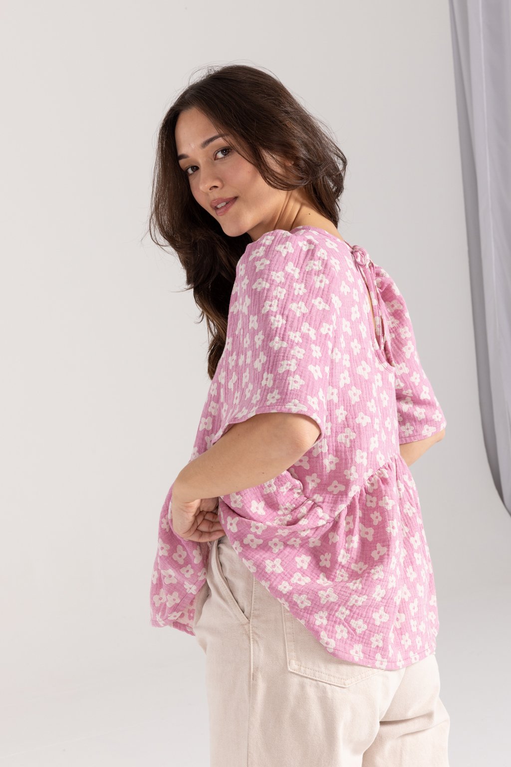 Lehká mušelínová halenka BETTY z bio bavlny je romantickým kouskem, do kterého se zamilujete. Tato halenka ma elegantní střih, který je přestřižený pod prsy, což dodává siluetě jemnou linii a klade důraz na pohodlí. Řasený volán přidává halence hravý a ženský nádech, zatímco nařasené balónové rukávy, poskytují maximální pohodlí. Kvalitní, prodyšný a odolný materiál je nenáročný na údržbu. Kulatý výstřih je na zadní straně zakončený kapkou se zavazováním na mašli. Můžete si vybrat z barevných provedení ve smetanové bílé, růžové nebo tmavě modré kostičce.