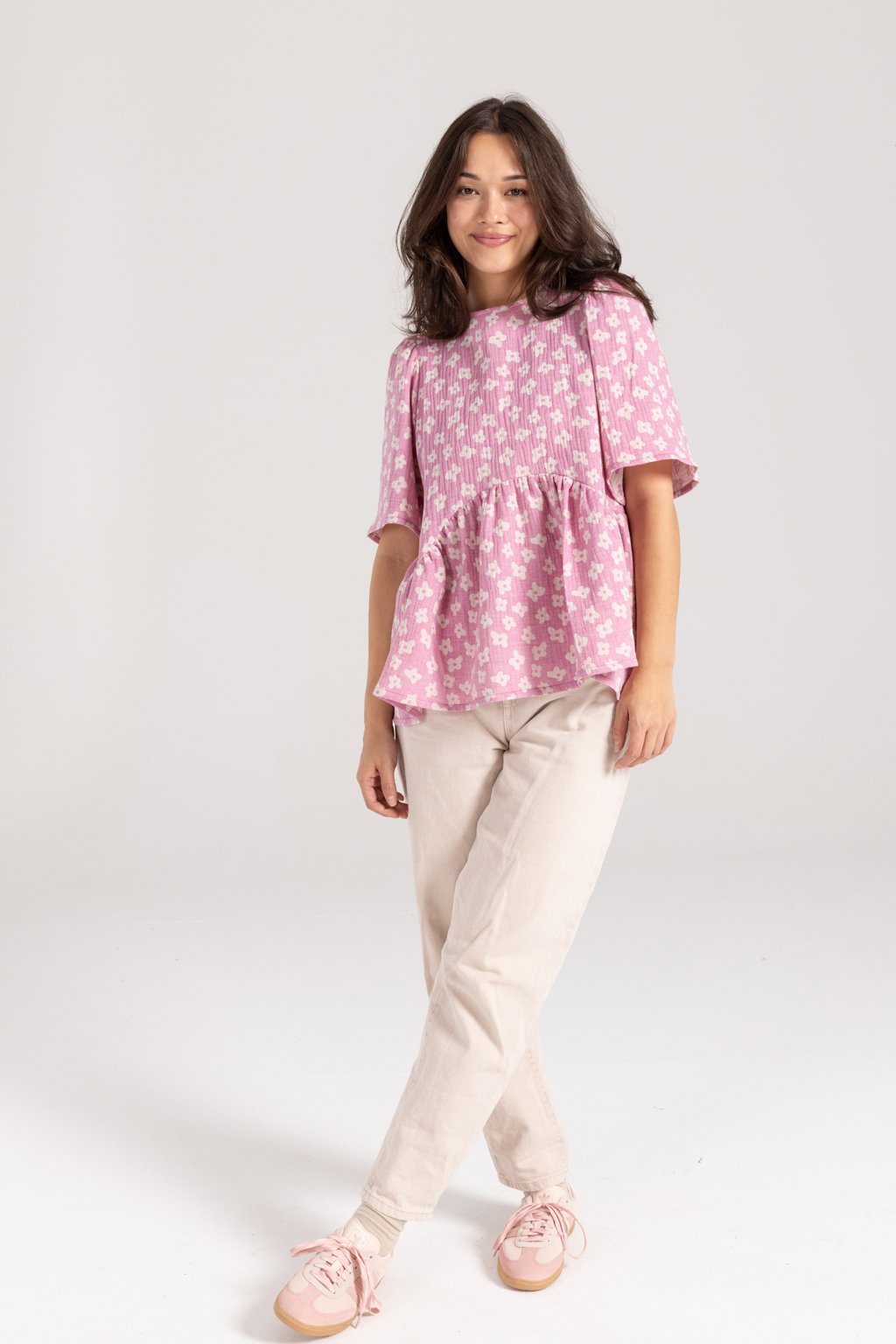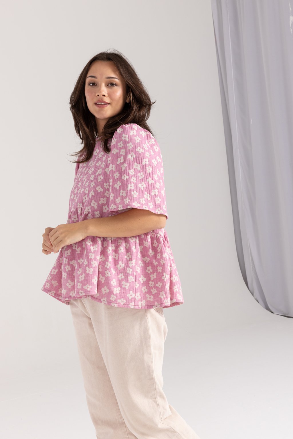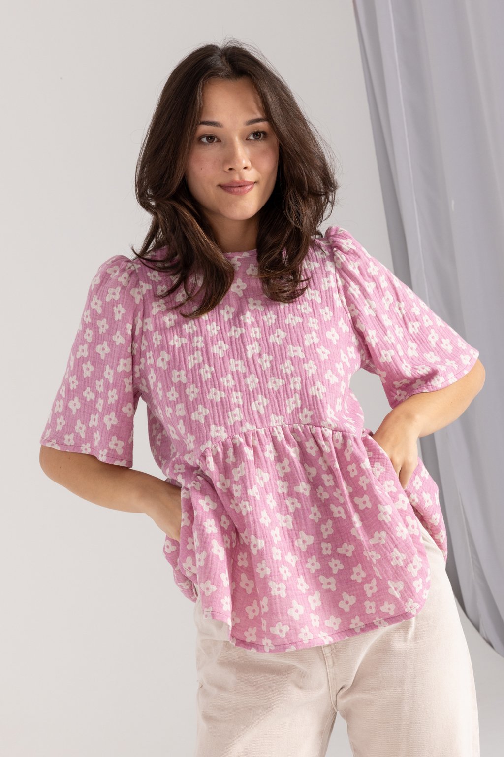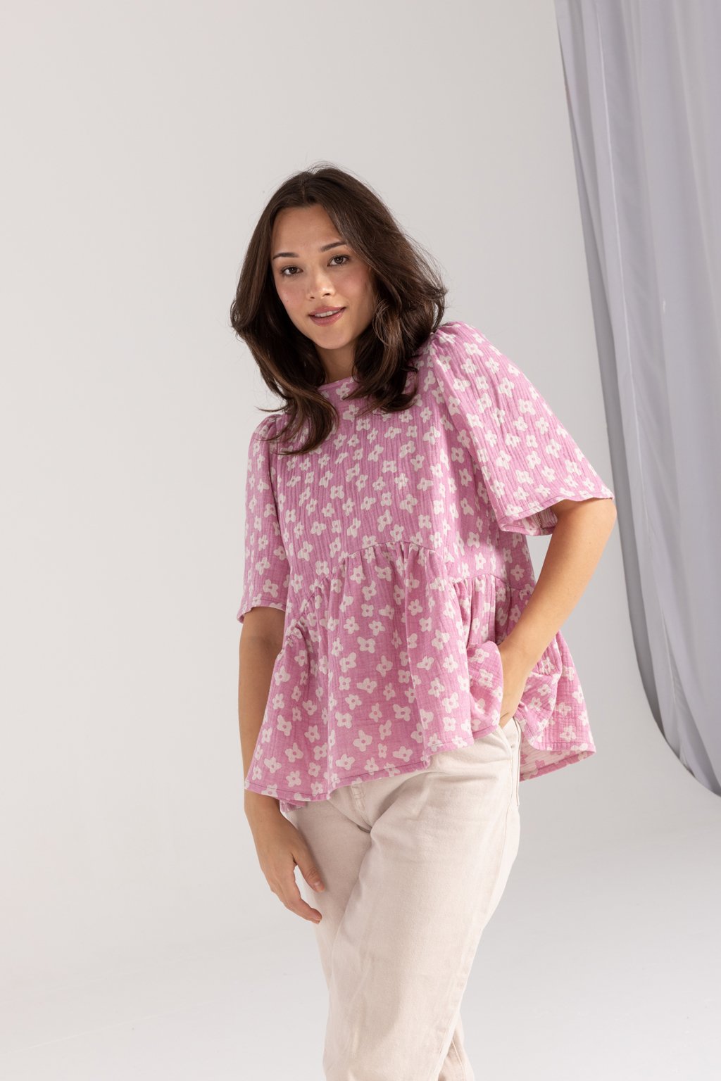 Lehká mušelínová halenka BETTY z bio bavlny je romantickým kouskem, do kterého se zamilujete. Tato halenka ma elegantní střih, který je přestřižený pod prsy, což dodává siluetě jemnou linii a klade důraz na pohodlí. Řasený volán přidává halence hravý a ženský nádech, zatímco nařasené balónové rukávy, poskytují maximální pohodlí. Kvalitní, prodyšný a odolný materiál je nenáročný na údržbu. Kulatý výstřih je na zadní straně zakončený kapkou se zavazováním na mašli. Můžete si vybrat z barevných provedení ve smetanové bílé, růžové nebo tmavě modré kostičce.