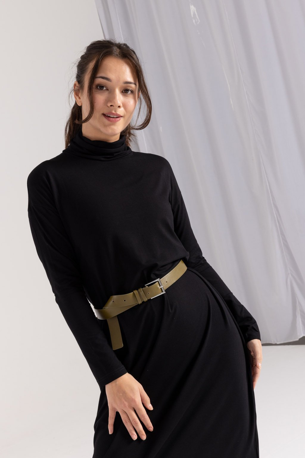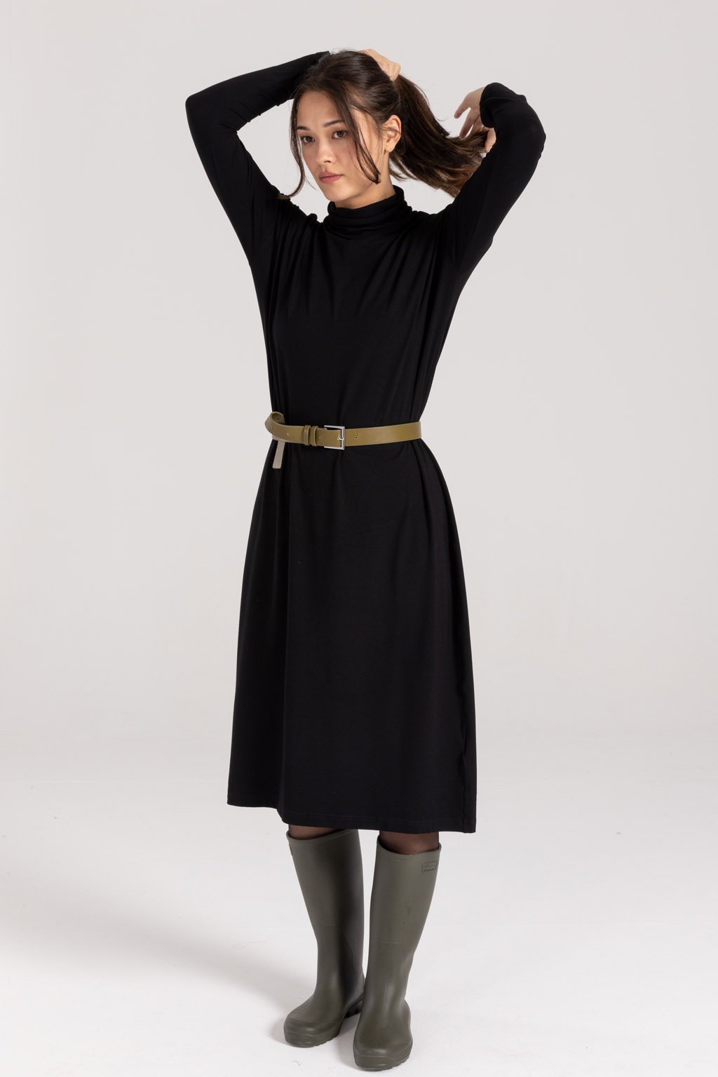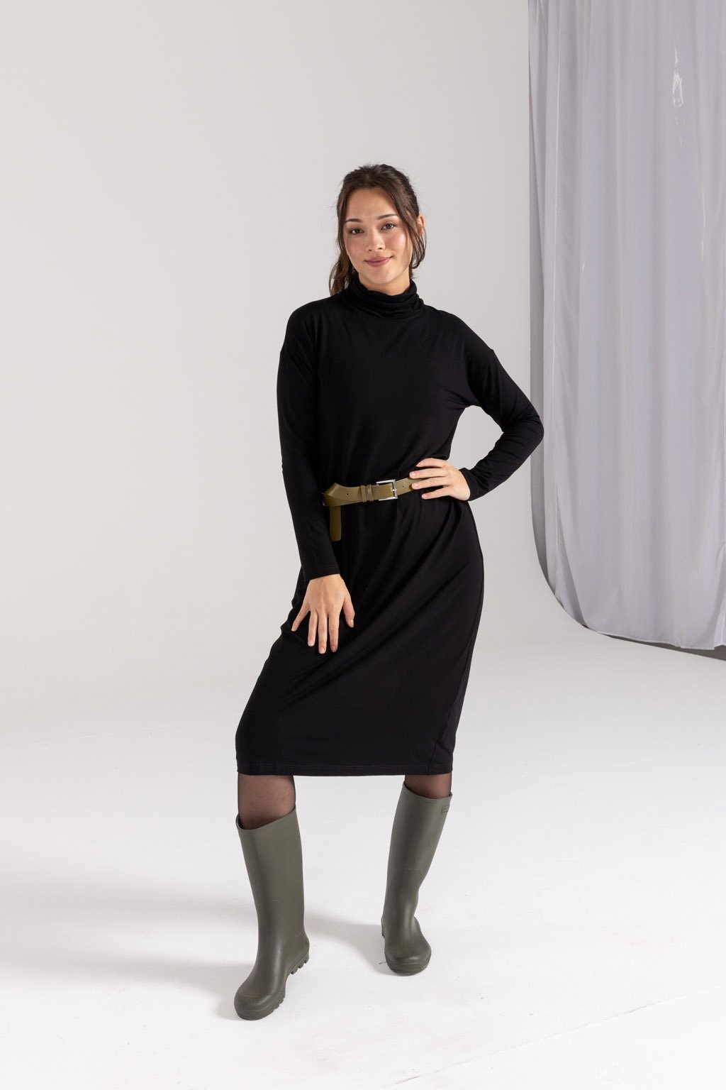 Tyto dlouhé úpletové šaty KARLA s vysokým rolákem vás zahřejí. Mají volnější pohodlný střih, dlouhý úzký rukáv a upravit je můžete volně přidaným páskem. Midi délka se hodí i na formálnější příležitosti, stačí doplnit vhodnými doplňky. Ušity ve čtyřech velikostech s velkorysým rozsahem, vhodné na menší postavu i pro plnoštíhlé.Vyberte si z olivově zelené, královské modré a klasické černé.