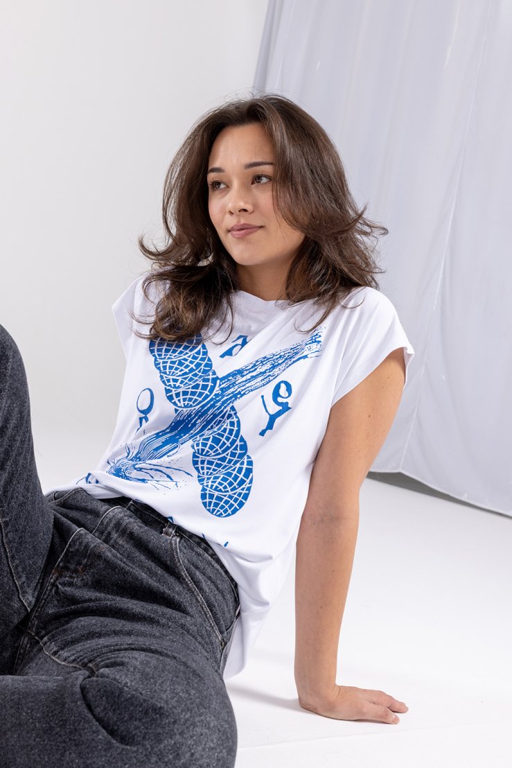 Plavkový top s oblíbeným potiskem. Motiv vznikl ve spolupráci s malířem Františkem Petrákem, jehož malba se stala ústředním motivem kolekce. Originální a pohodlný top New Face...