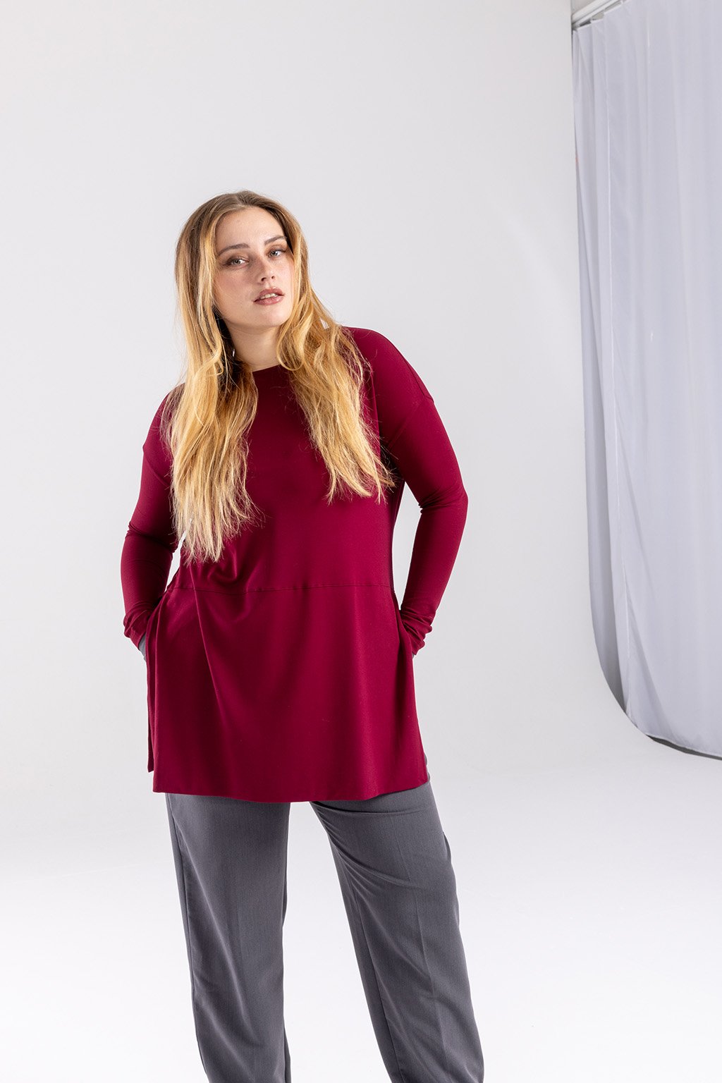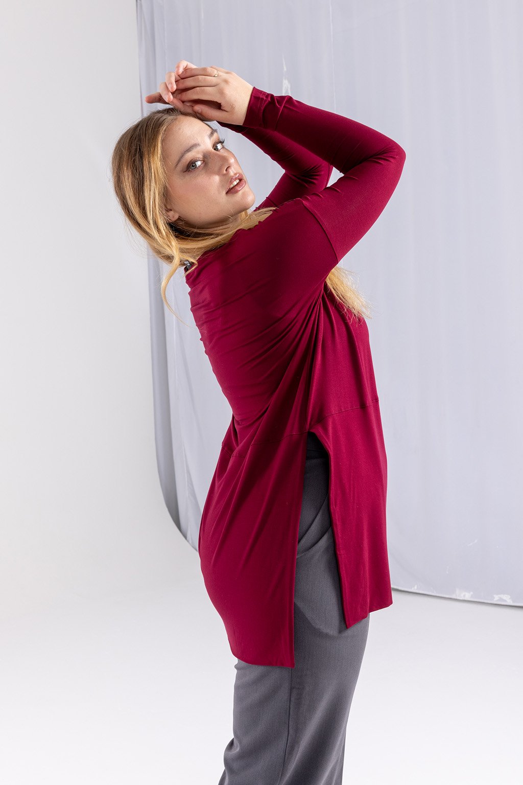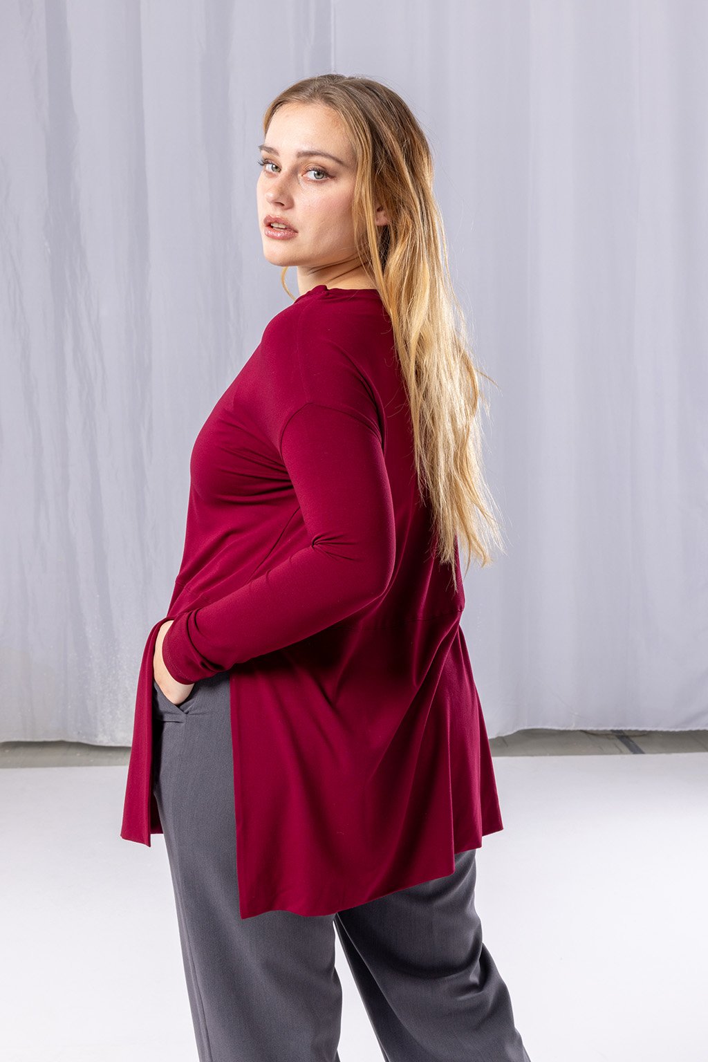 Top s dlouhým rukávem LEA je vyroben z příjemného viskózového úpletu. Tričko má volný střih s přepadlými rameny, úzkými rukávy a lehce prodlouženou délkou. Dlouhé rozparky po stranách vedou do pasu, kde je přestřižen, proto opticky lichotí postavě. V černé, olivově zelené a bordó.