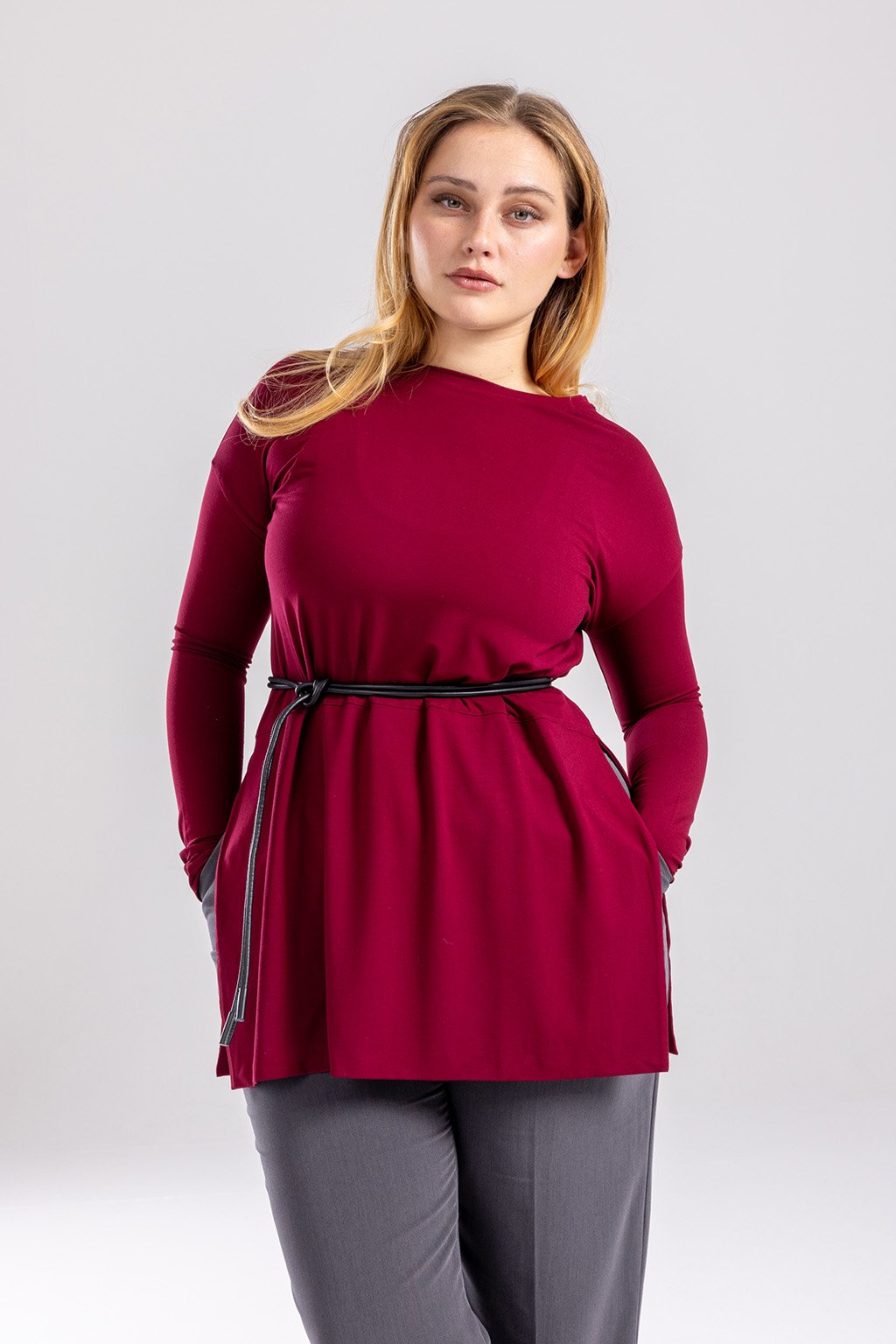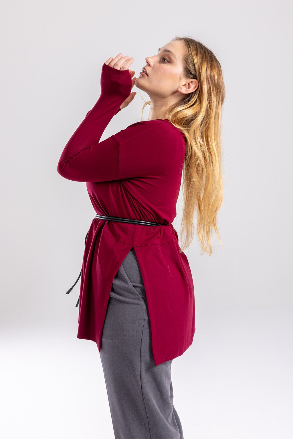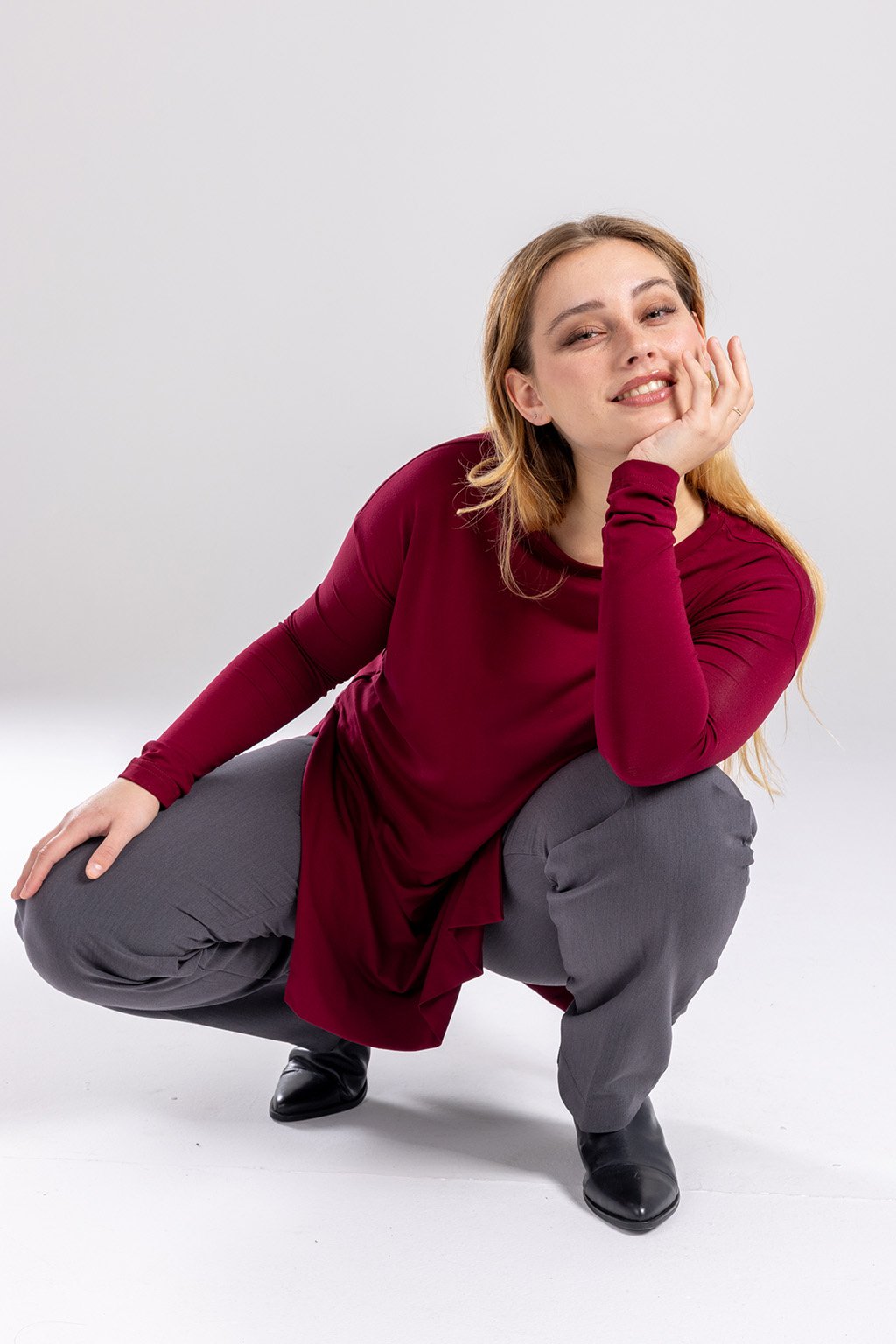 Top s dlouhým rukávem LEA je vyroben z příjemného viskózového úpletu. Tričko má volný střih s přepadlými rameny, úzkými rukávy a lehce prodlouženou délkou. Dlouhé rozparky po stranách vedou do pasu, kde je přestřižen, proto opticky lichotí postavě. V černé, olivově zelené a bordó.