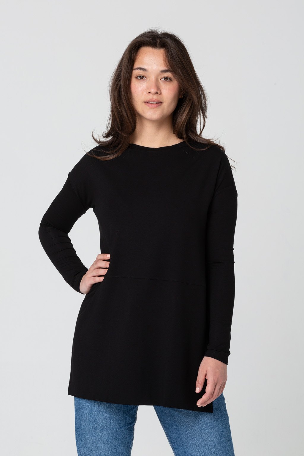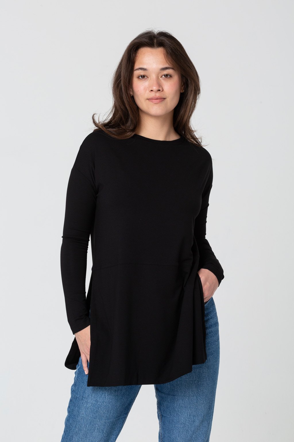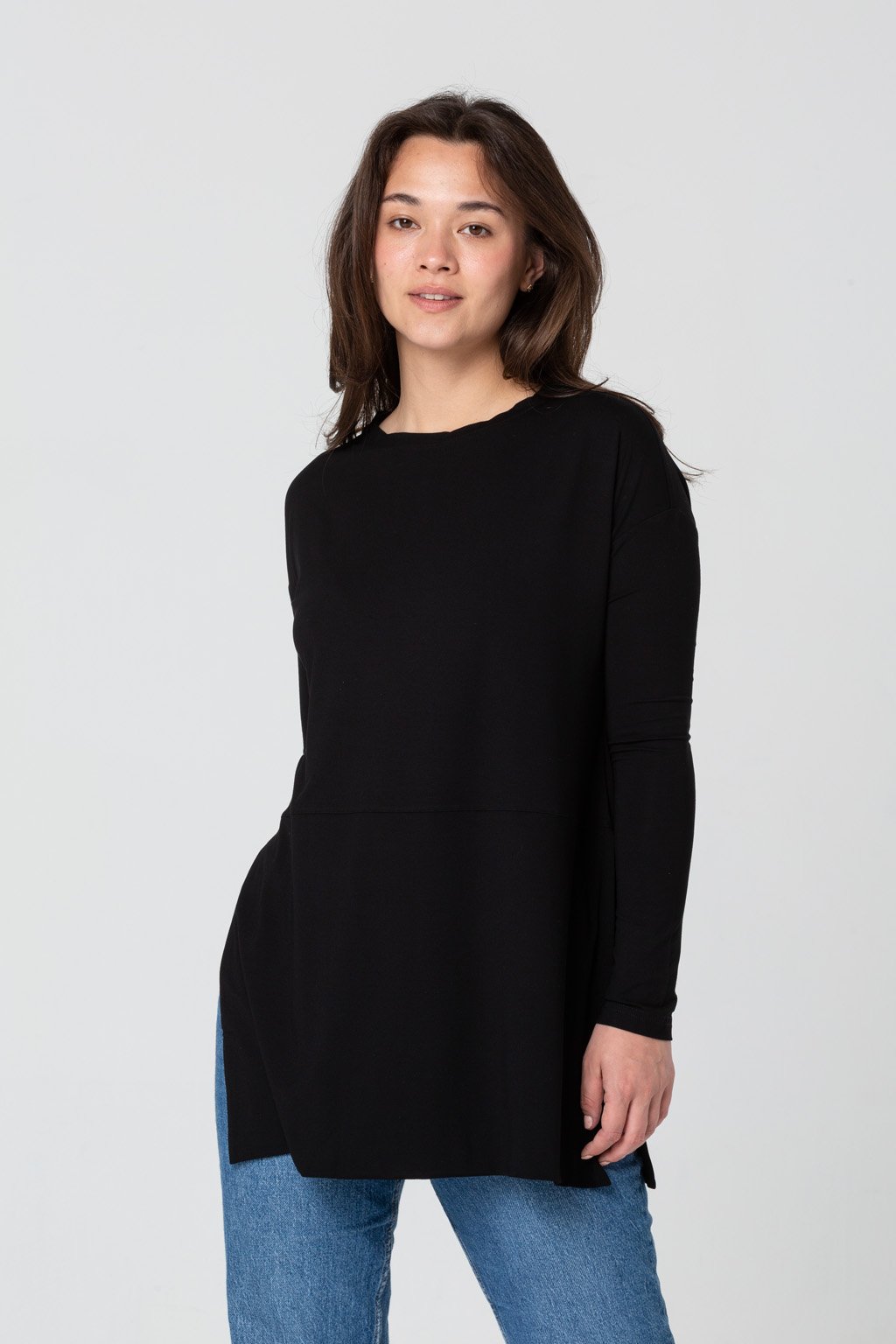 Top s dlouhým rukávem LEA je vyroben z příjemného viskózového úpletu. Tričko má volný střih s přepadlými rameny, úzkými rukávy a lehce prodlouženou délkou. Dlouhé rozparky po stranách vedou do pasu, kde je přestřižen, proto opticky lichotí postavě. V černé, olivově zelené a bordó.