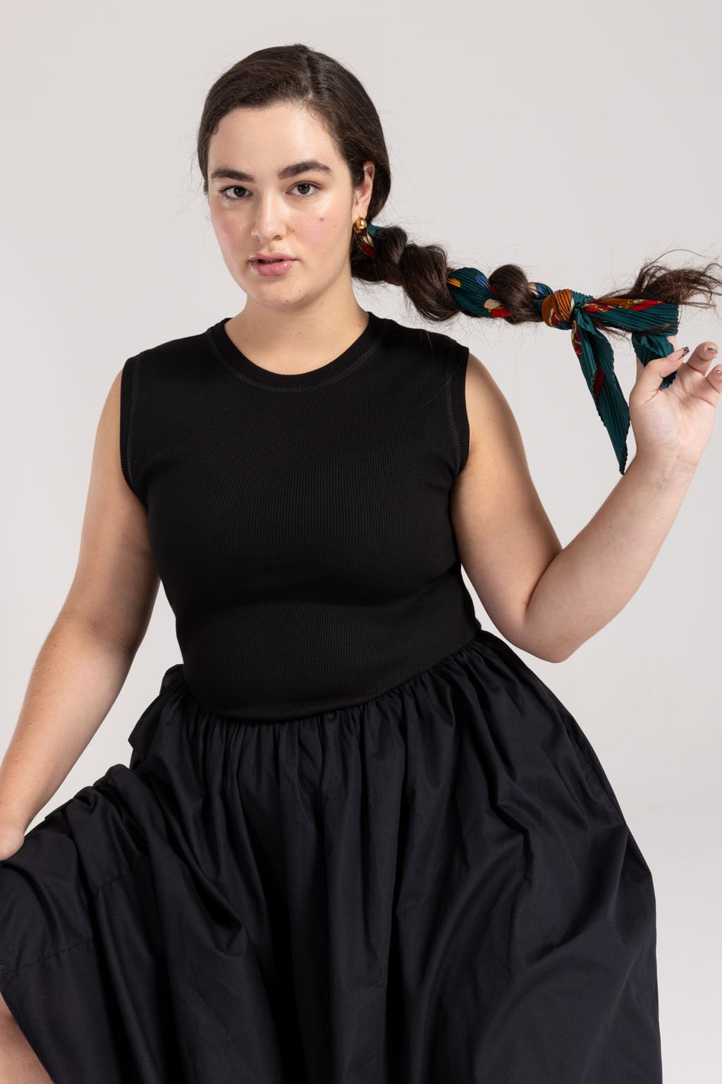 Modelka měří 170 cm a má na sobě velikost M.