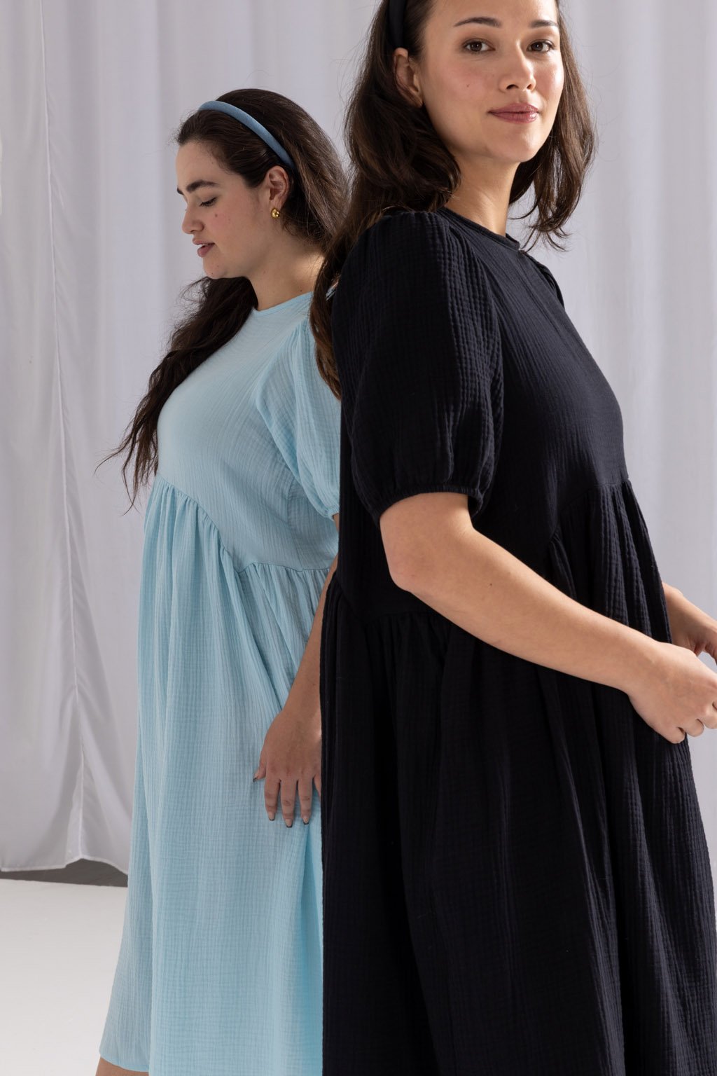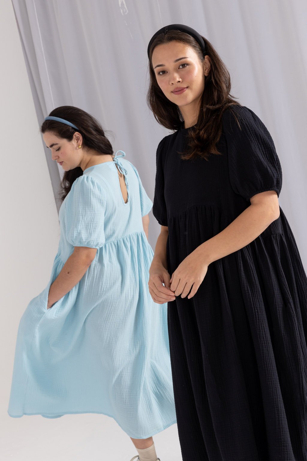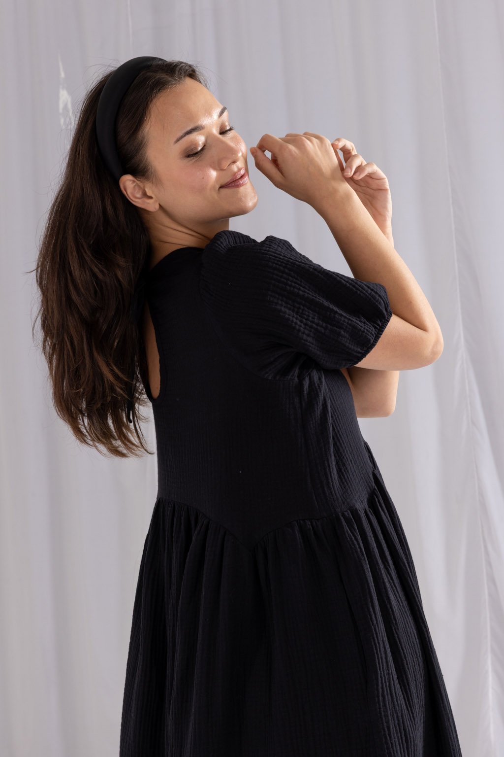 Lehké mušelínové šaty MIA z bio bavlny jsou romantickým kouskem, do kterého se zamilujete. Tyto šaty mají elegantní střih, který je přestřižený pod prsy, což dodává siluetě jemnou linii a klade důraz na pohodlí. Řasená sukně s kapsami v midi délce přidává šatům hravý a ženský nádech, zatímco nařasené balónové rukávy, ukončené gumou, poskytují maximální pohodlí. Kvalitní, prodyšný a odolný materiál je nenáročný na údržbu. Kulatý výstřih je na zadní straně zakončený kapkou se zavazováním na mašli.