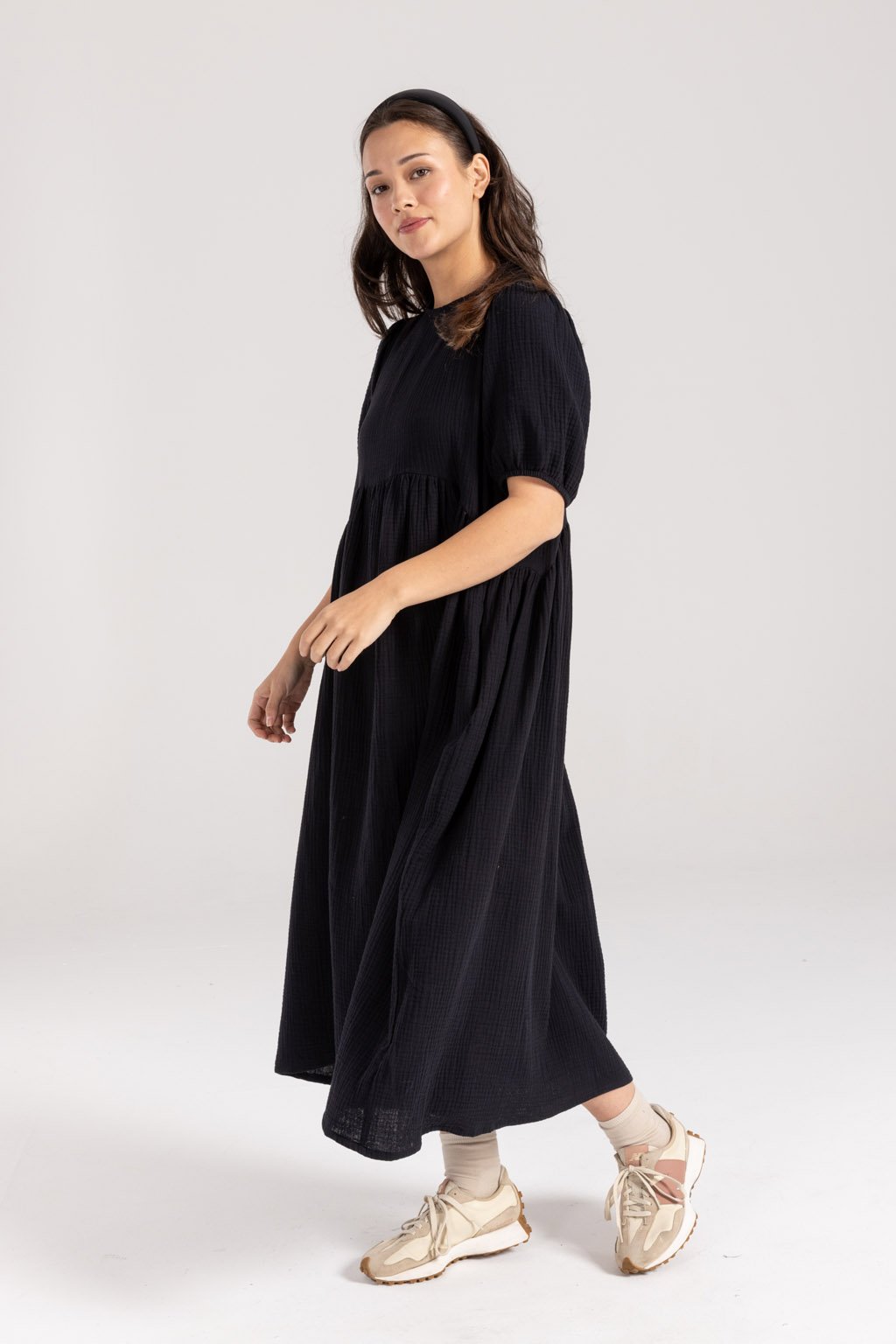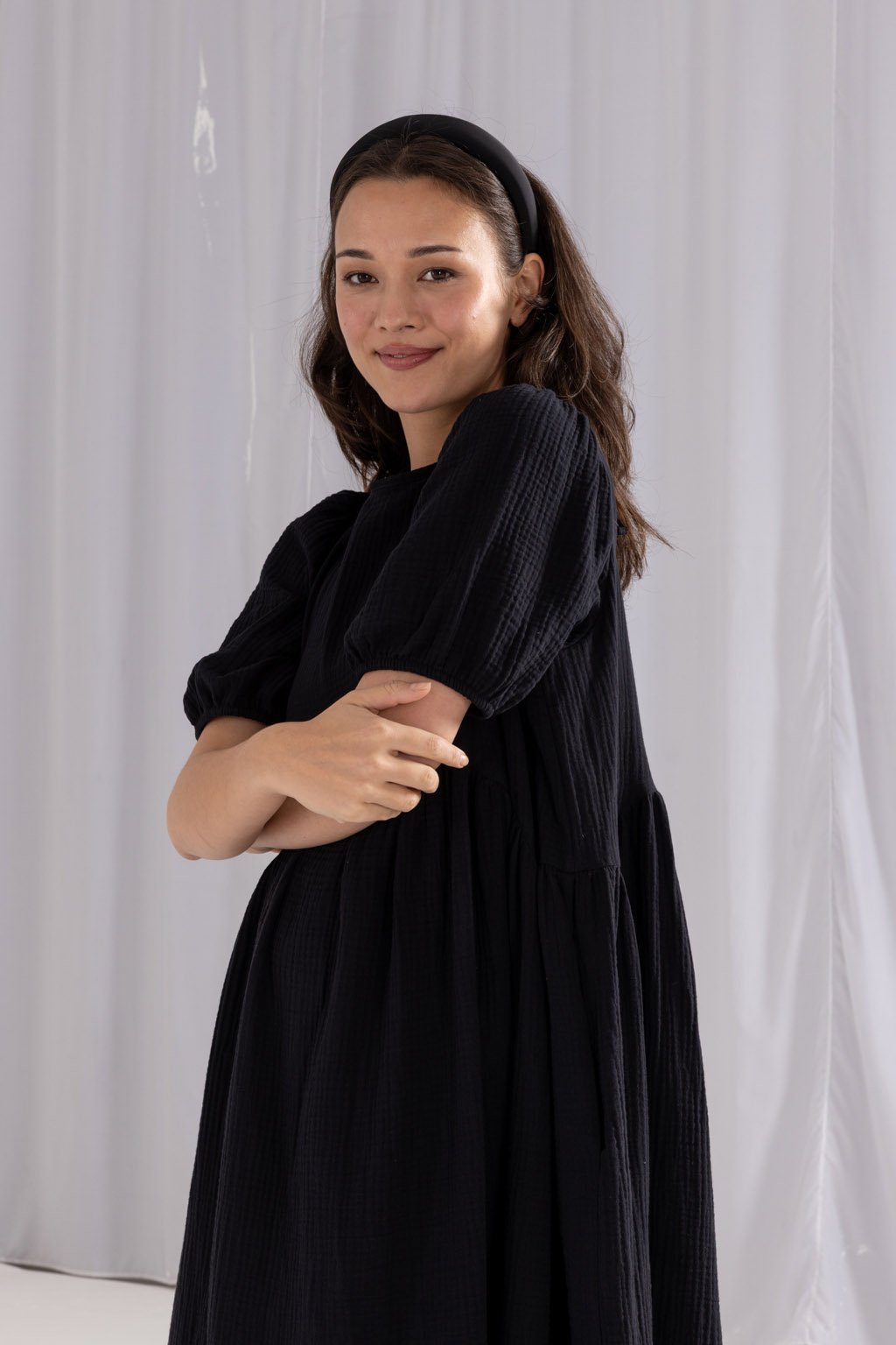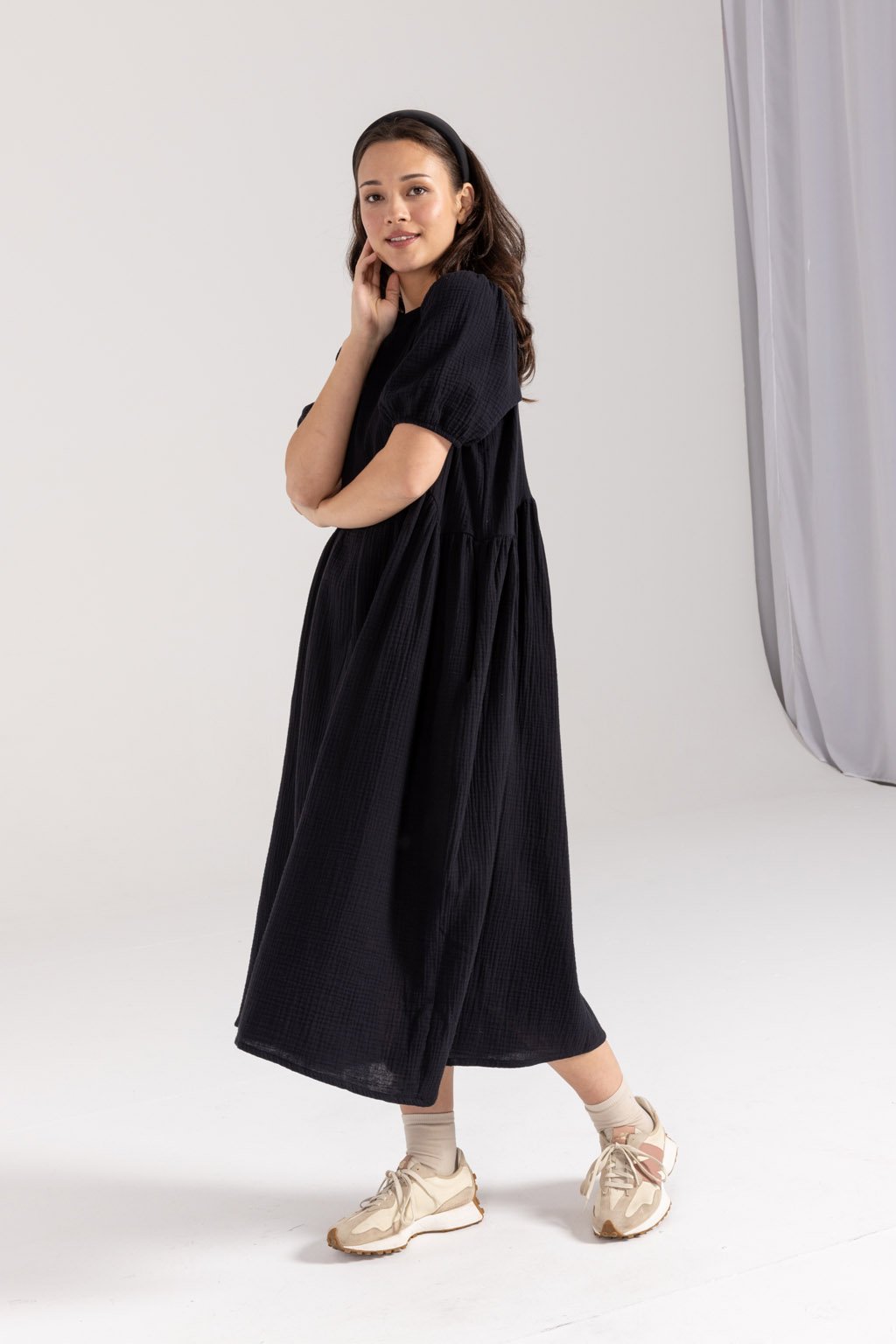 Lehké mušelínové šaty MIA z bio bavlny jsou romantickým kouskem, do kterého se zamilujete. Tyto šaty mají elegantní střih, který je přestřižený pod prsy, což dodává siluetě jemnou linii a klade důraz na pohodlí. Řasená sukně s kapsami v midi délce přidává šatům hravý a ženský nádech, zatímco nařasené balónové rukávy, ukončené gumou, poskytují maximální pohodlí. Kvalitní, prodyšný a odolný materiál je nenáročný na údržbu. Kulatý výstřih je na zadní straně zakončený kapkou se zavazováním na mašli.