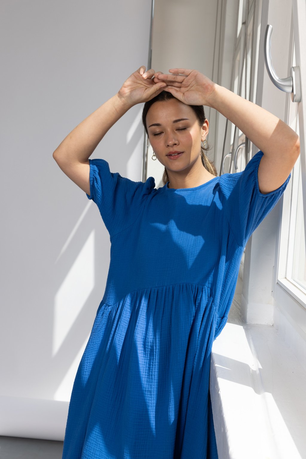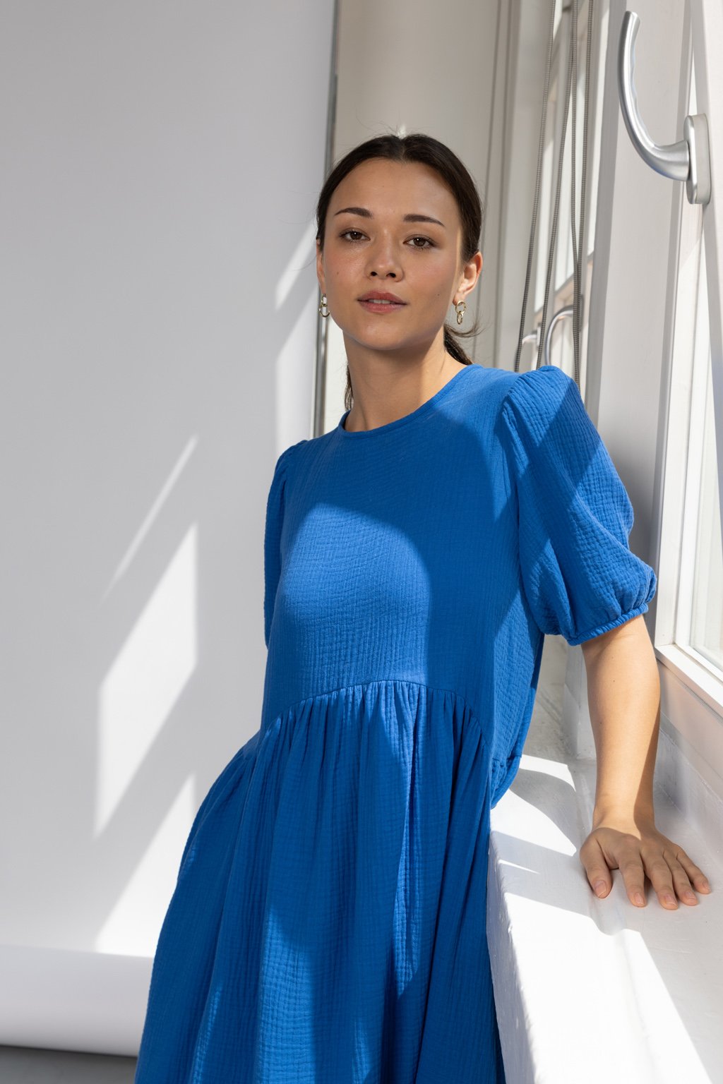 Lehké mušelínové šaty MIA z bio bavlny jsou romantickým kouskem, do kterého se zamilujete. Tyto šaty mají elegantní střih, který je přestřižený pod prsy, což dodává siluetě jemnou linii a klade důraz na pohodlí. Řasená sukně s kapsami v midi délce přidává šatům hravý a ženský nádech, zatímco nařasené balónové rukávy, ukončené gumou, poskytují maximální pohodlí. Kvalitní, prodyšný a odolný materiál je nenáročný na údržbu. Kulatý výstřih je na zadní straně zakončený kapkou se zavazováním na mašli. Můžete si vybrat z barevných provedení ve smetanové, růžové, kobaltové, tmavě modré nebo šedé kostky.