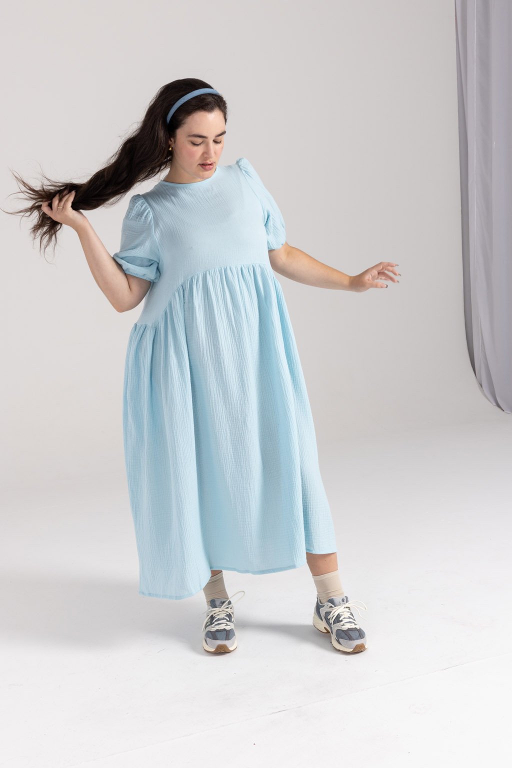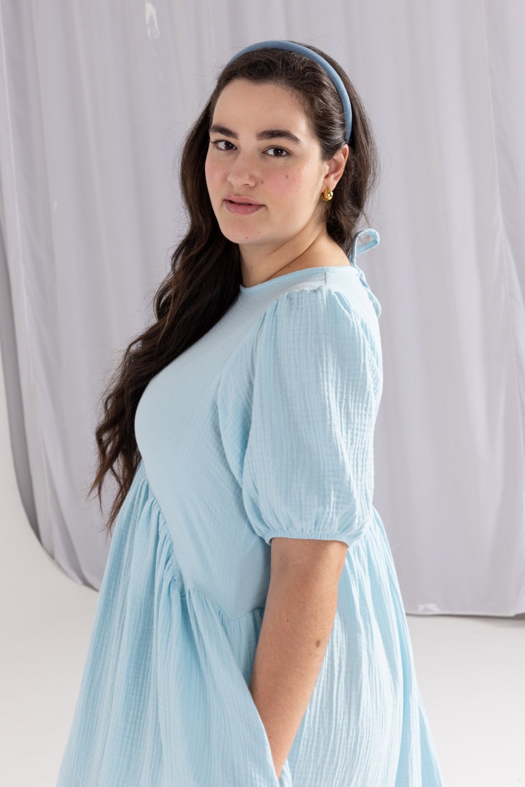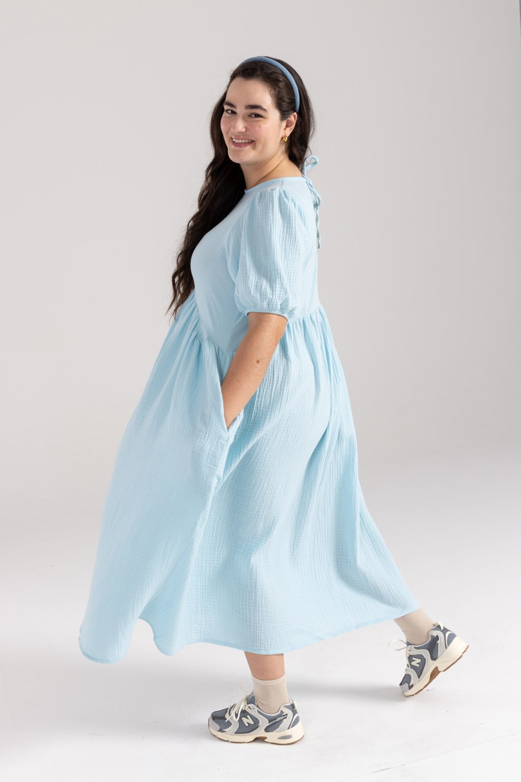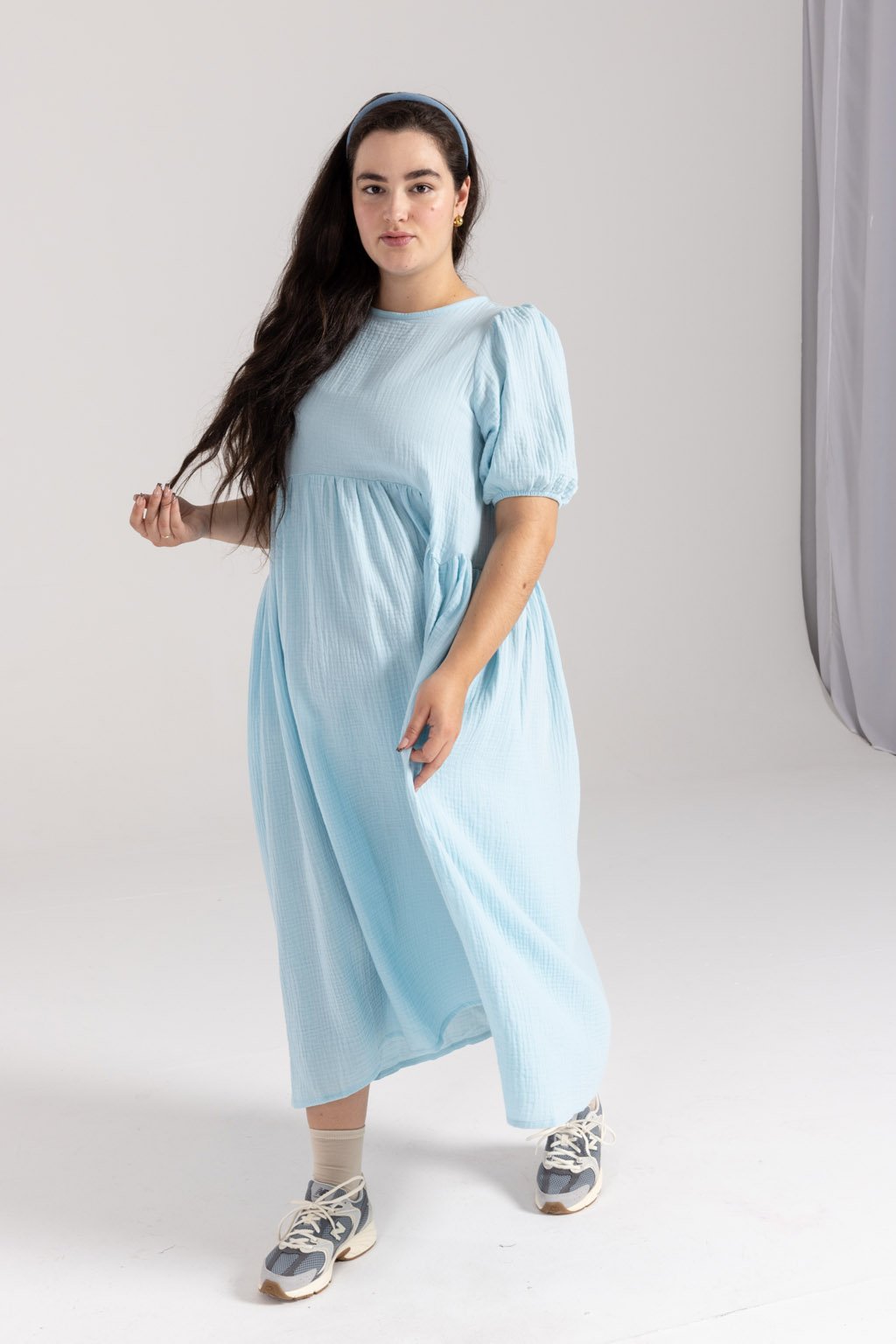 Lehké mušelínové šaty MIA z bio bavlny jsou romantickým kouskem, do kterého se zamilujete. Tyto šaty mají elegantní střih, který je přestřižený pod prsy, což dodává siluetě jemnou linii a klade důraz na pohodlí. Řasená sukně s kapsami v midi délce přidává šatům hravý a ženský nádech, zatímco nařasené balónové rukávy, ukončené gumou, poskytují maximální pohodlí. Kvalitní, prodyšný a odolný materiál je nenáročný na údržbu. Kulatý výstřih je na zadní straně zakončený kapkou se zavazováním na mašli. Můžete si vybrat z barevných provedení ve smetanové, růžové, kobaltové, tmavě modré nebo šedé kostky.