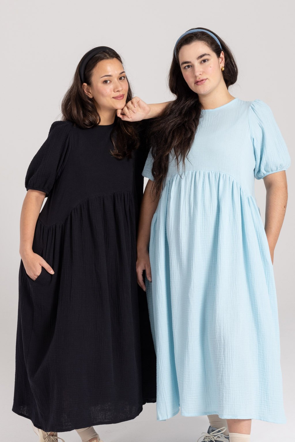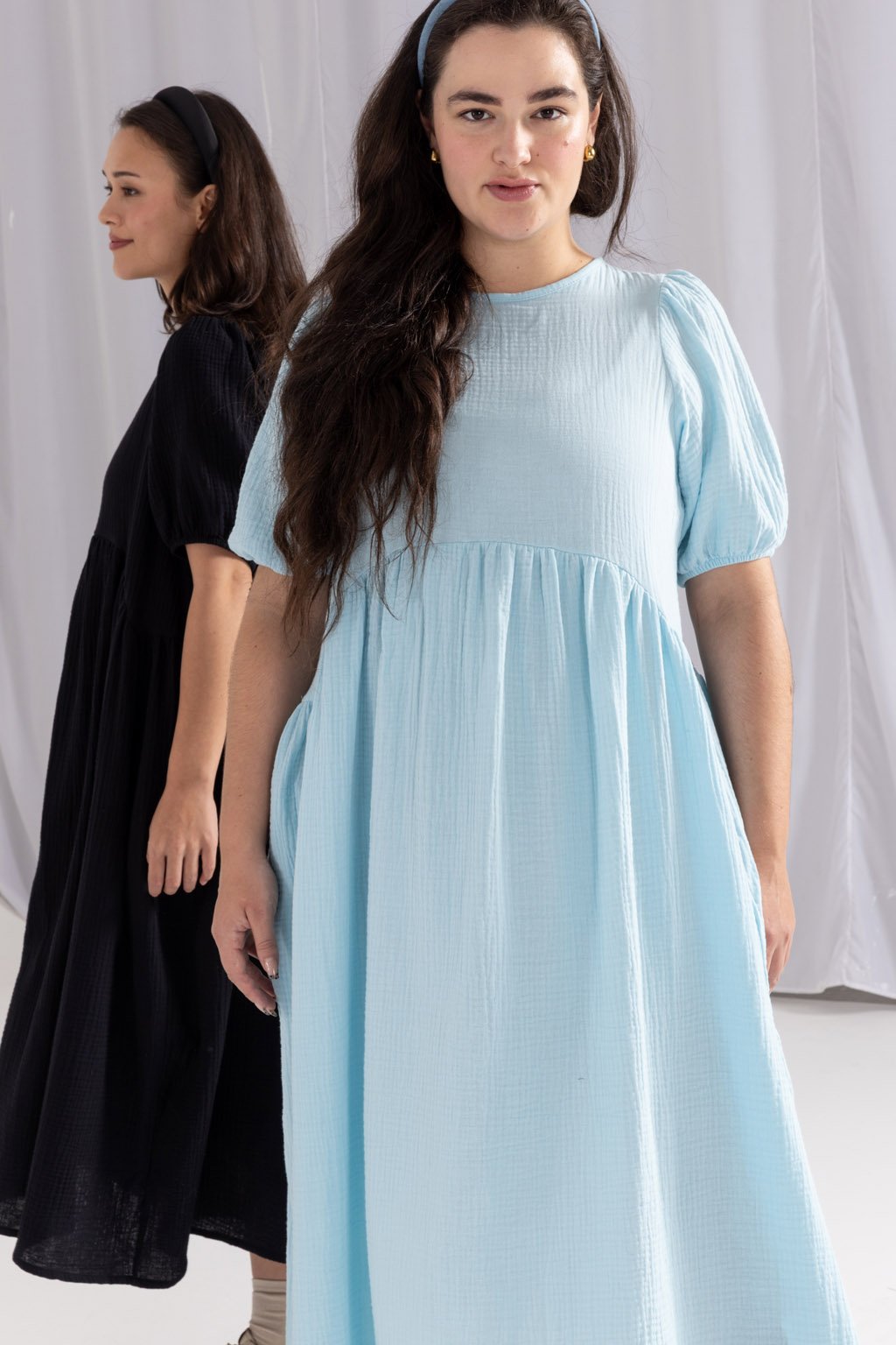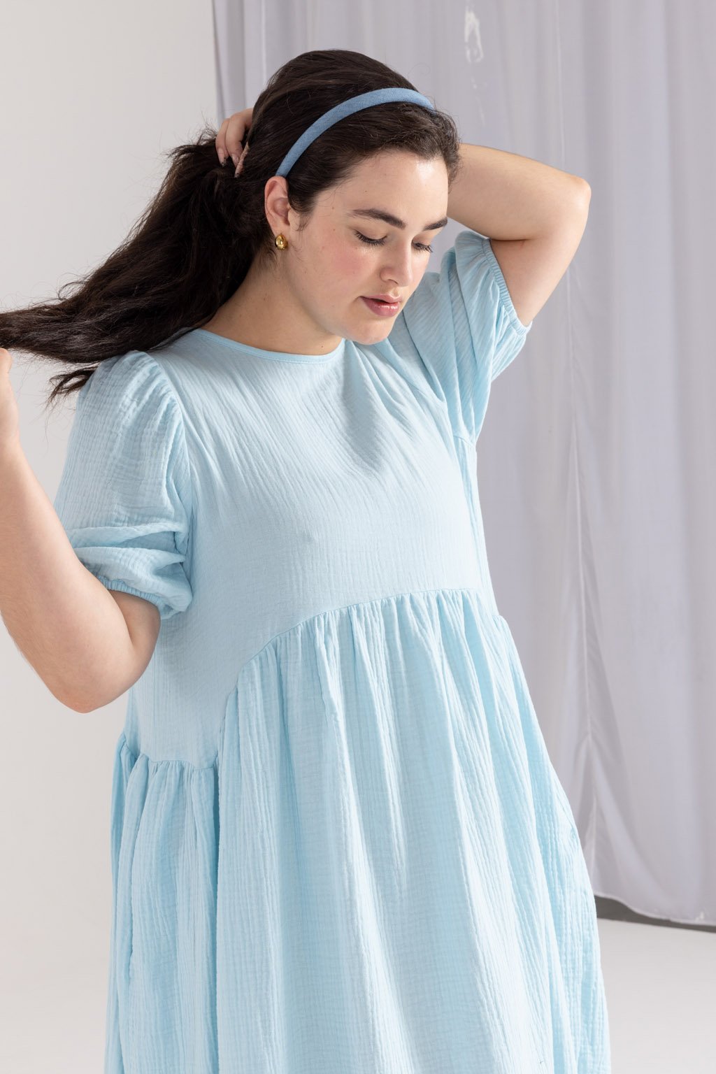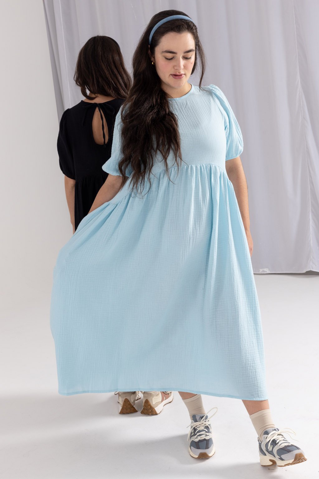 Lehké mušelínové šaty MIA z bio bavlny jsou romantickým kouskem, do kterého se zamilujete. Tyto šaty mají elegantní střih, který je přestřižený pod prsy, což dodává siluetě jemnou linii a klade důraz na pohodlí. Řasená sukně s kapsami v midi délce přidává šatům hravý a ženský nádech, zatímco nařasené balónové rukávy, ukončené gumou, poskytují maximální pohodlí. Kvalitní, prodyšný a odolný materiál je nenáročný na údržbu. Kulatý výstřih je na zadní straně zakončený kapkou se zavazováním na mašli. Můžete si vybrat z barevných provedení ve smetanové, růžové, kobaltové, tmavě modré nebo šedé kostky.