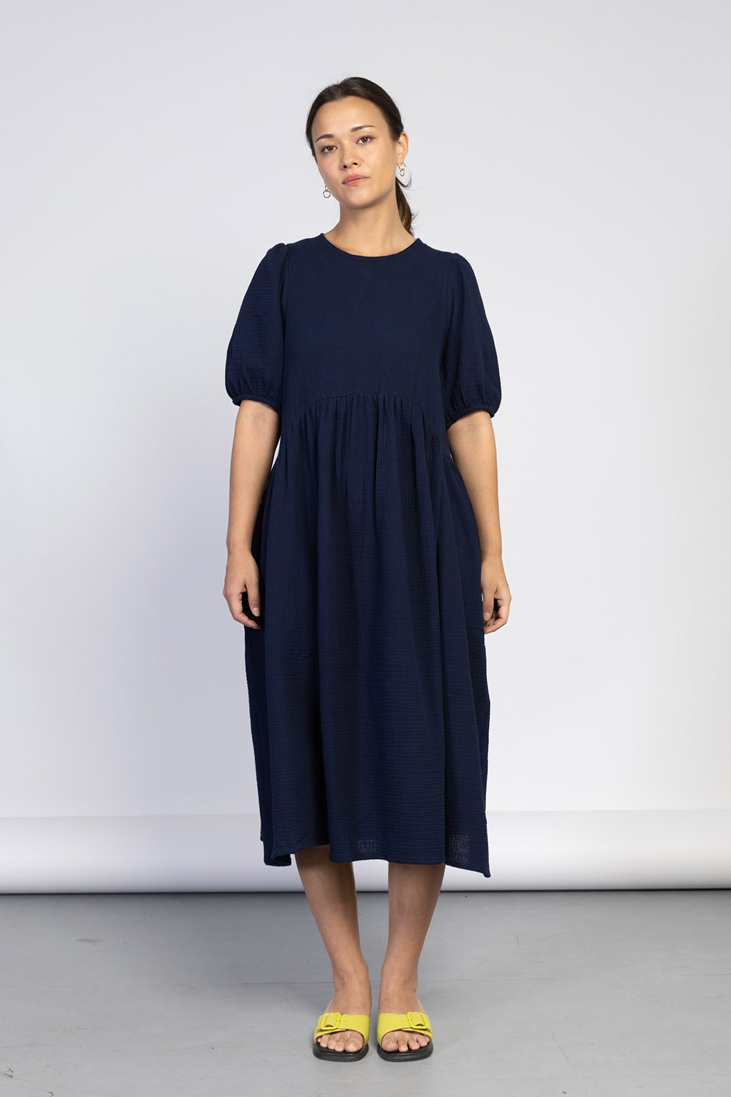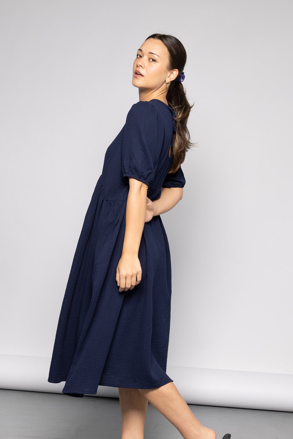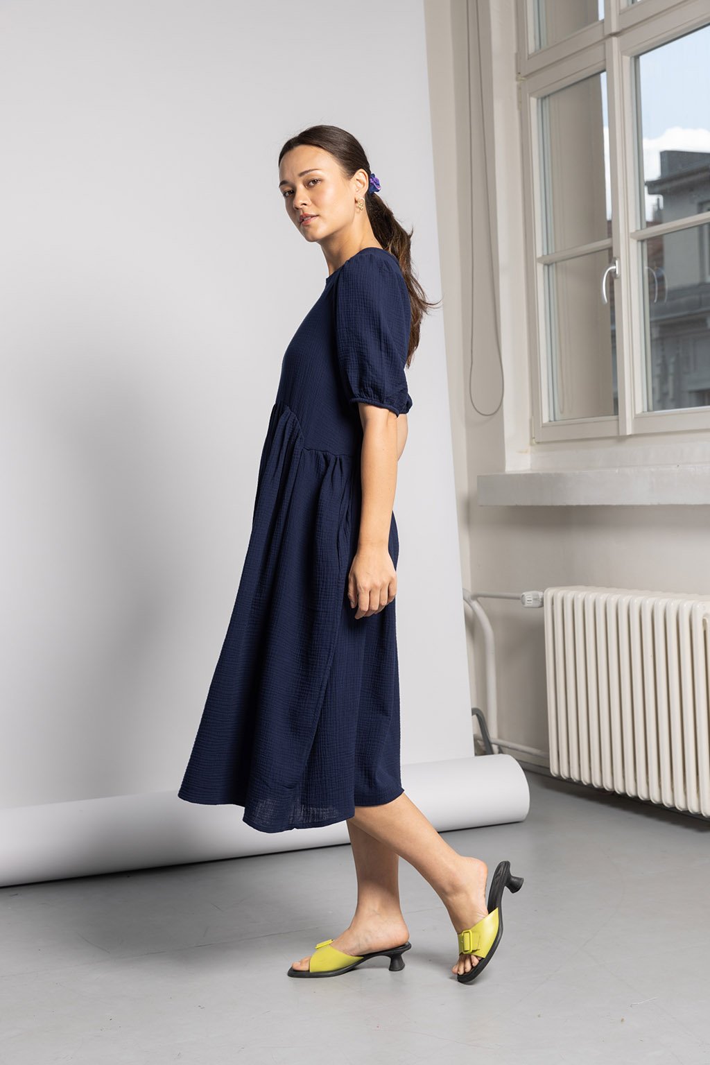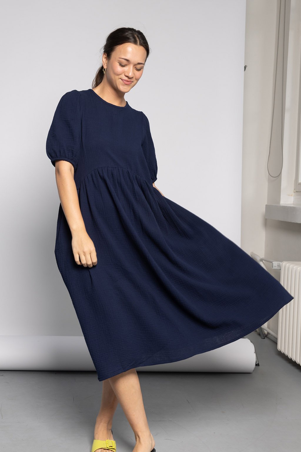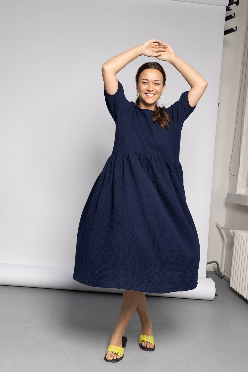 Lehké mušelínové šaty MIA z bio bavlny jsou romantickým kouskem, do kterého se zamilujete. Tyto šaty mají elegantní střih, který je přestřižený pod prsy, což dodává siluetě jemnou linii a klade důraz na pohodlí. Řasená sukně s kapsami v midi délce přidává šatům hravý a ženský nádech, zatímco nařasené balónové rukávy, ukončené gumou, poskytují maximální pohodlí. Kvalitní, prodyšný a odolný materiál je nenáročný na údržbu. Kulatý výstřih je na zadní straně zakončený kapkou se zavazováním na mašli. Můžete si vybrat z barevných provedení ve smetanové, růžové, kobaltové, tmavě modré nebo šedé kostky.